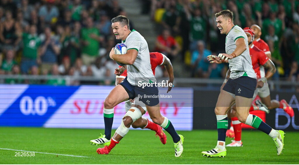 16 September 2023; Jonathan Sexton of Ireland on his way to scoring his side's fourth try and becoming his country's all-time record points scorer in international rugby during the 2023 Rugby World Cup Pool B match between Ireland and Tonga at Stade de la Beaujoire in Nantes, France. Photo by Brendan Moran/Sportsfile