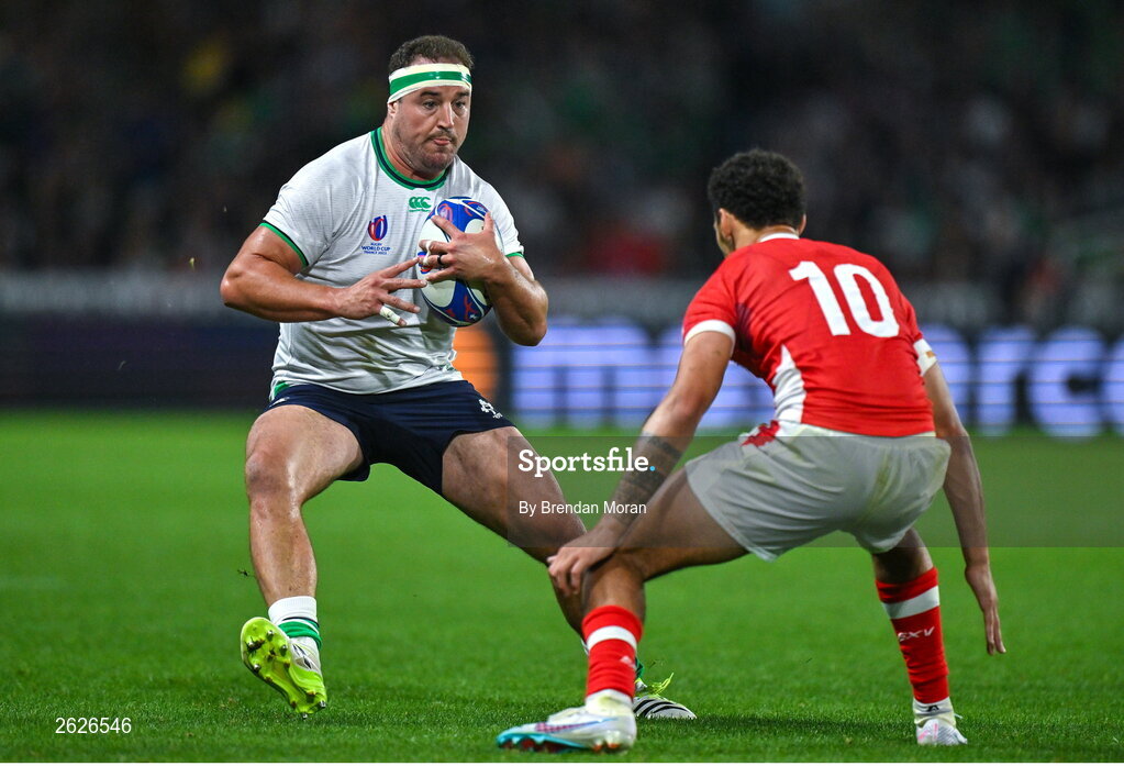 16 September 2023; Rob Herring of Ireland in action against William Havili of Tonga during the 2023 Rugby World Cup Pool B match between Ireland and Tonga at Stade de la Beaujoire in Nantes, France. Photo by Brendan Moran/Sportsfile