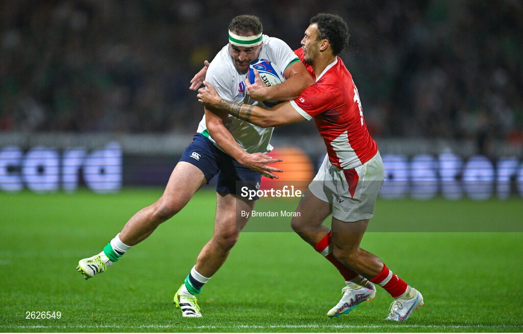 16 September 2023; Rob Herring of Ireland is tackled by William Havili of Tonga during the 2023 Rugby World Cup Pool B match between Ireland and Tonga at Stade de la Beaujoire in Nantes, France. Photo by Brendan Moran/Sportsfile