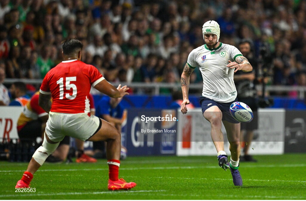 16 September 2023; Mack Hansen of Ireland in action against Salesi Piutau of Tonga during the 2023 Rugby World Cup Pool B match between Ireland and Tonga at Stade de la Beaujoire in Nantes, France. Photo by Brendan Moran/Sportsfile