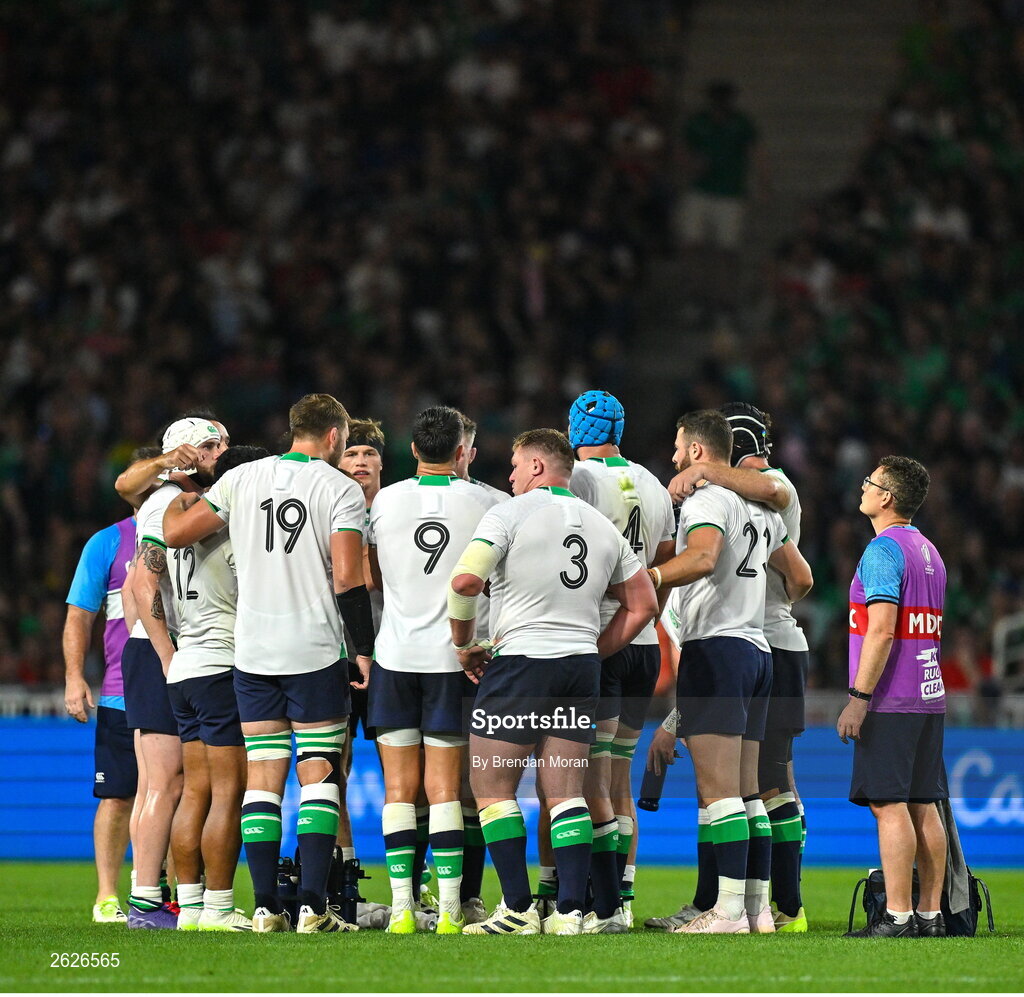 16 September 2023; The Ireland team huddle during the 2023 Rugby World Cup Pool B match between Ireland and Tonga at Stade de la Beaujoire in Nantes, France. Photo by Brendan Moran/Sportsfile