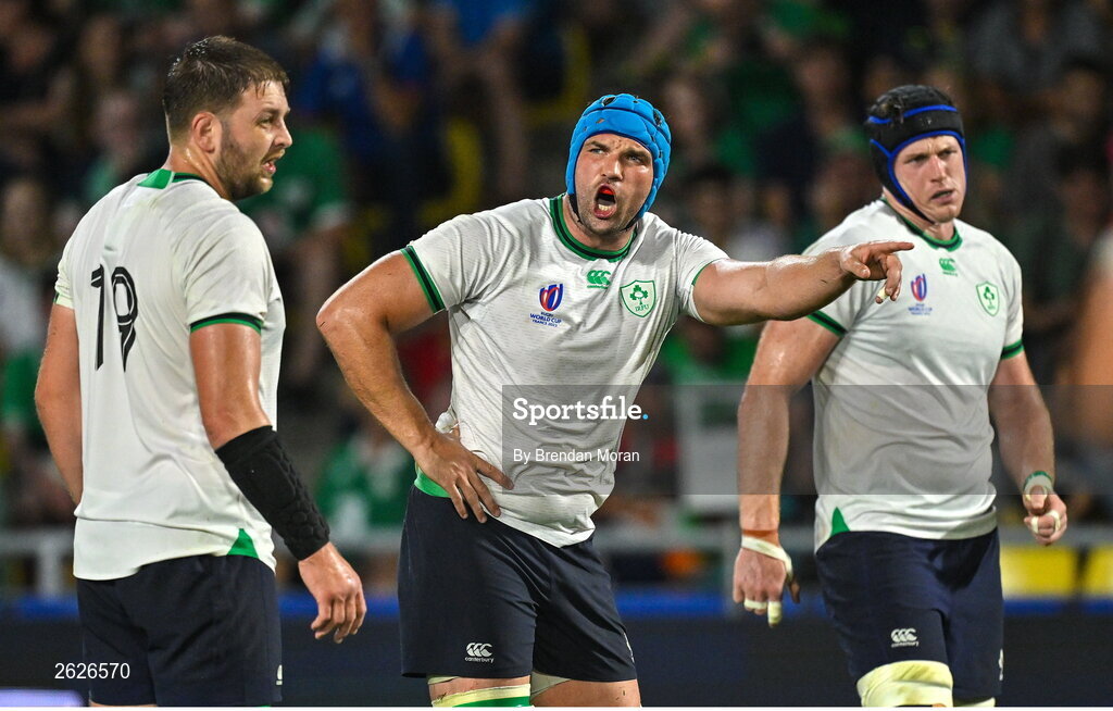 16 September 2023; Tadhg Beirne of Ireland, centre, with teammates Iain Henderson, left, and Ryan Baird during the 2023 Rugby World Cup Pool B match between Ireland and Tonga at Stade de la Beaujoire in Nantes, France. Photo by Brendan Moran/Sportsfile
