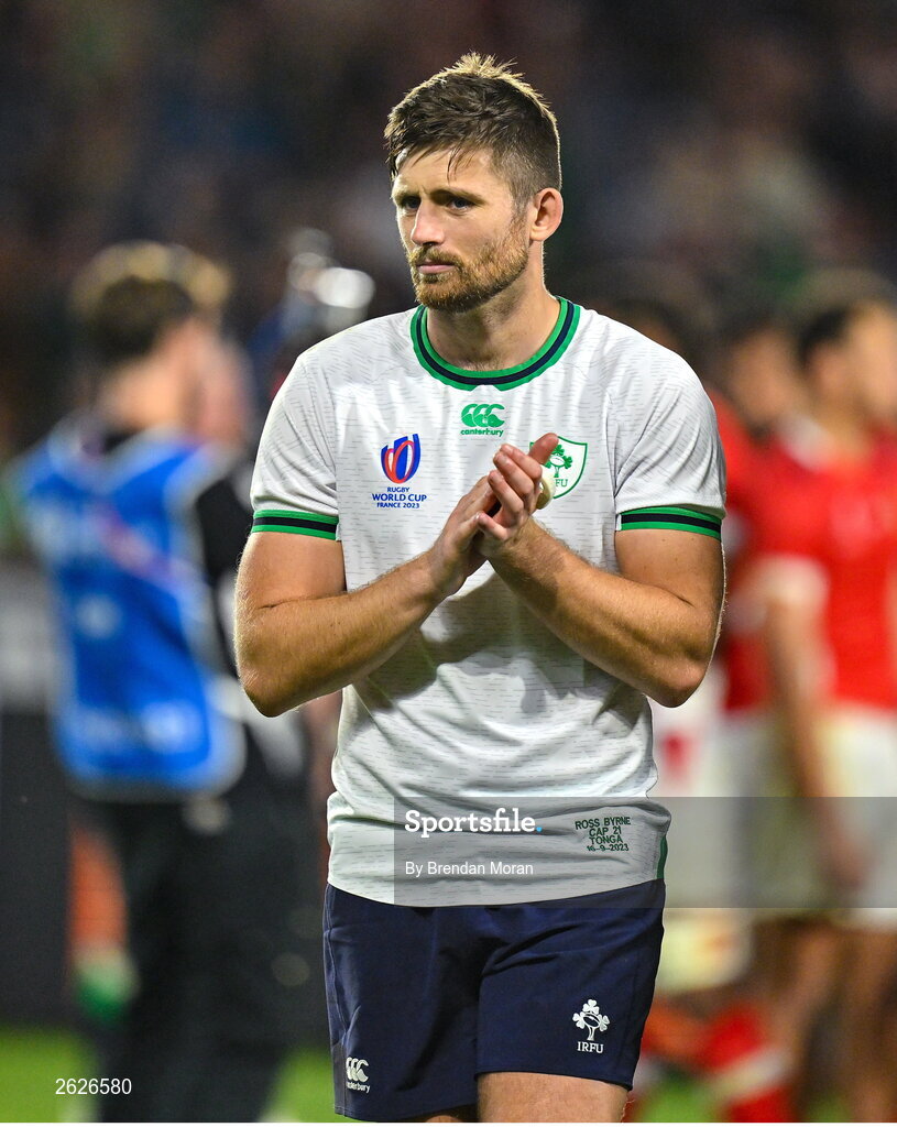 16 September 2023; Ross Byrne of Ireland after the 2023 Rugby World Cup Pool B match between Ireland and Tonga at Stade de la Beaujoire in Nantes, France. Photo by Brendan Moran/Sportsfile