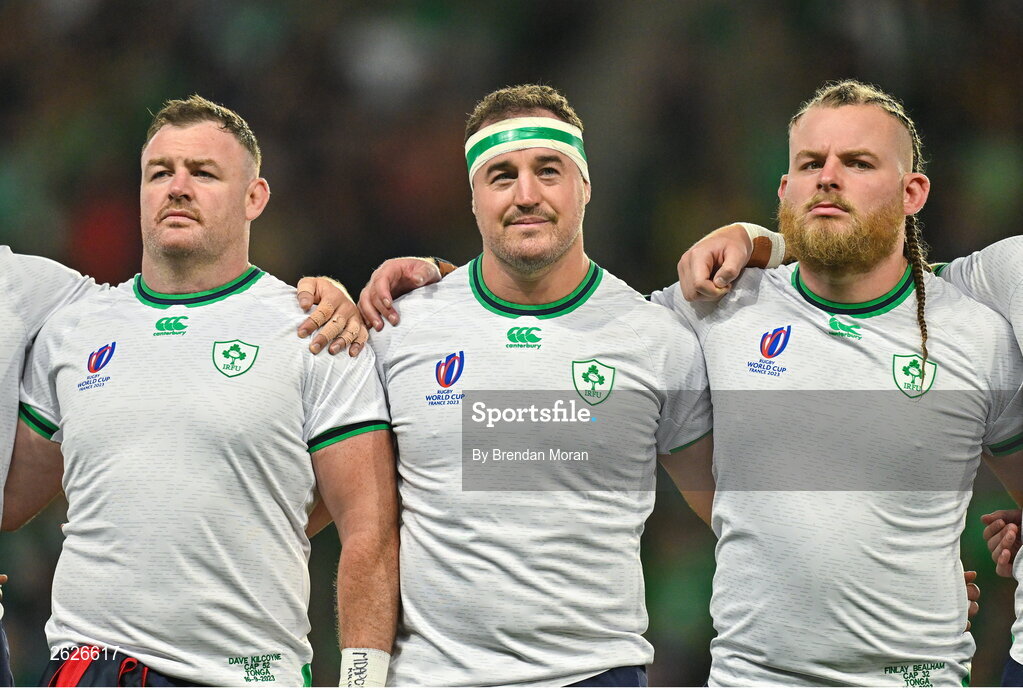 16 September 2023; Ireland players, from left, Dave Kilcoyne, Rob Herring and Finlay Bealham during the national anthems before the 2023 Rugby World Cup Pool B match between Ireland and Tonga at Stade de la Beaujoire in Nantes, France. Photo by Brendan Moran/Sportsfile
