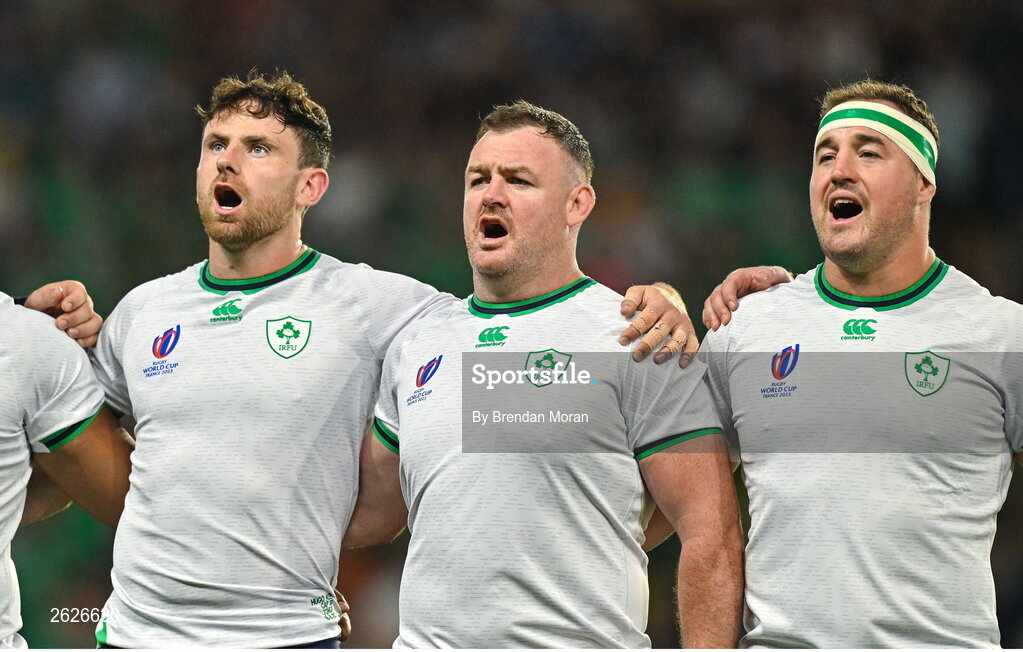 16 September 2023; Ireland players, from left, Hugo Keenan, Dave Kilcoyne and Rob Herring during the national anthems before the 2023 Rugby World Cup Pool B match between Ireland and Tonga at Stade de la Beaujoire in Nantes, France. Photo by Brendan Moran/Sportsfile