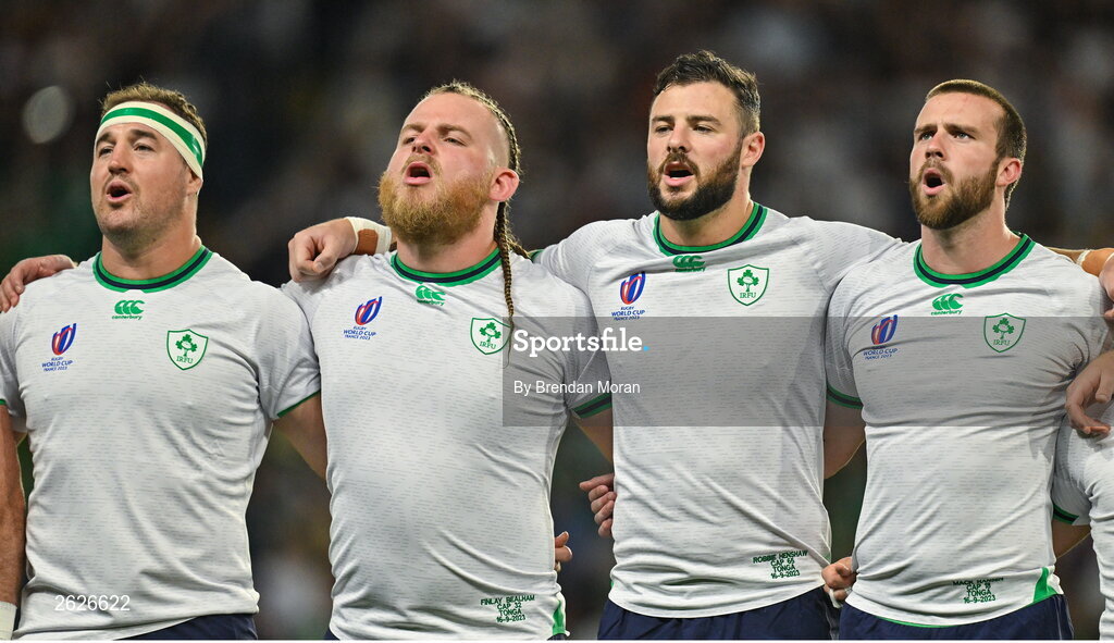 16 September 2023; Ireland players, from left, Rob Herring, Finlay Bealham, Robbie Henshaw and Mack Hansen during the national anthems before the 2023 Rugby World Cup Pool B match between Ireland and Tonga at Stade de la Beaujoire in Nantes, France. Photo by Brendan Moran/Sportsfile