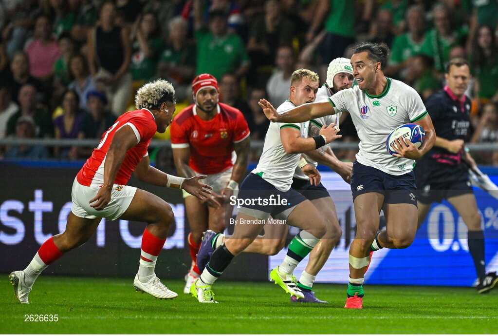 16 September 2023; James Lowe of Ireland during the 2023 Rugby World Cup Pool B match between Ireland and Tonga at Stade de la Beaujoire in Nantes, France. Photo by Brendan Moran/Sportsfile