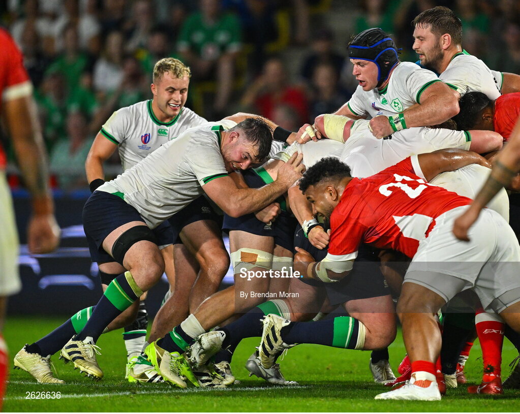 16 September 2023; Peter O’Mahony, left, Ryan Baird, Iain Henderson of Ireland control a maul during the 2023 Rugby World Cup Pool B match between Ireland and Tonga at Stade de la Beaujoire in Nantes, France. Photo by Brendan Moran/Sportsfile