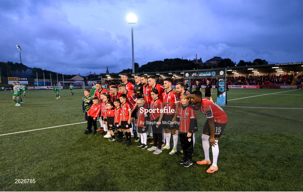 15 September 2023; Derry City players and mascots pose for a photograph before the SSE Airtricity Men's Premier Division match between Derry City and Shamrock Rovers at The Ryan McBride Brandywell Stadium in Derry. Photo by Stephen McCarthy/Sportsfile