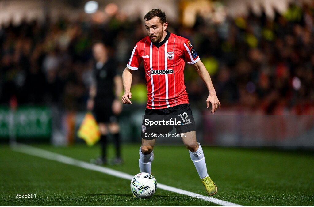 15 September 2023; Paul McMullan of Derry City during the SSE Airtricity Men's Premier Division match between Derry City and Shamrock Rovers at The Ryan McBride Brandywell Stadium in Derry. Photo by Stephen McCarthy/Sportsfile