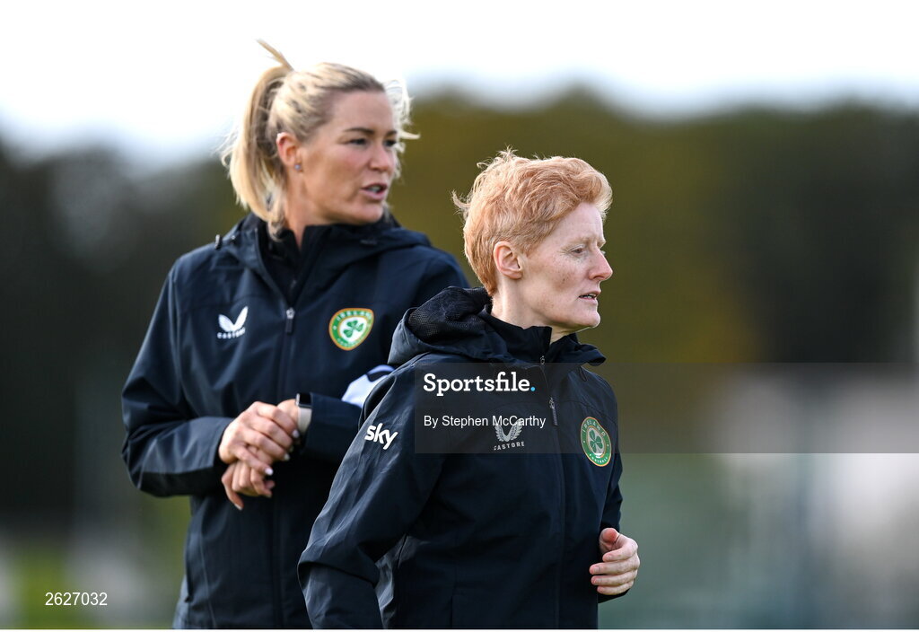 18 September 2023; Interim head coach Eileen Gleeson and interim assistant coach Emma Byrne, left, during a Republic of Ireland women training session at the FAI National Training Centre in Abbotstown, Dublin. Photo by Stephen McCarthy/Sportsfile