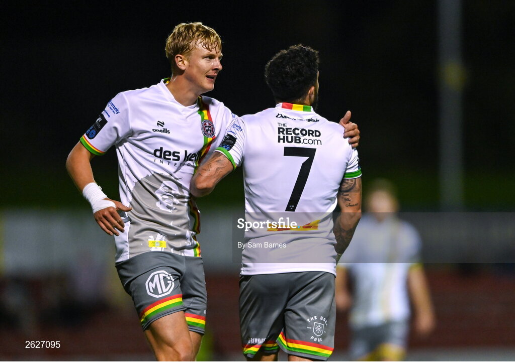 18 September 2023; Declan McDaid of Bohemians, 7, celebrates with team-mate Kris Twardek after scoring his side's second goal during the Leinster Football Senior Cup Final match between Usher Celtic and Bohemians at Dalymount Park in Dublin. Photo by Sam Barnes/Sportsfile