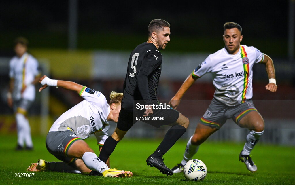 18 September 2023; Jordan Buckley of Usher Celtic in action against Kris Twardek, left, and Declan McDaid of Bohemians during the Leinster Football Senior Cup Final match between Usher Celtic and Bohemians at Dalymount Park in Dublin. Photo by Sam Barnes/Sportsfile
