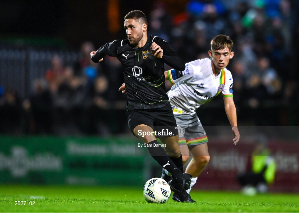18 September 2023; Jordan Buckley of Usher Celtic in action against Billy Gilmore of Bohemians during the Leinster Football Senior Cup Final match between Usher Celtic and Bohemians at Dalymount Park in Dublin. Photo by Sam Barnes/Sportsfile