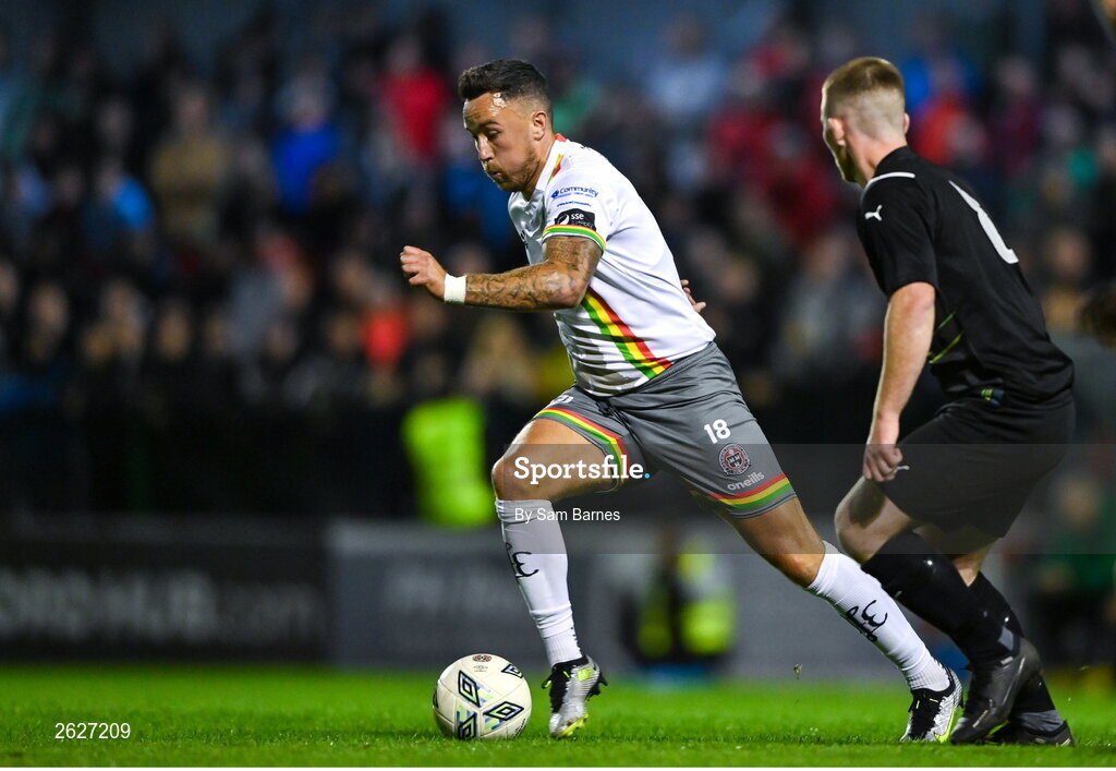 18 September 2023; John O’Sullivan of Bohemians in action against Calvin Douglas of Usher Celtic during the Leinster Football Senior Cup Final match between Usher Celtic and Bohemians at Dalymount Park in Dublin. Photo by Sam Barnes/Sportsfile