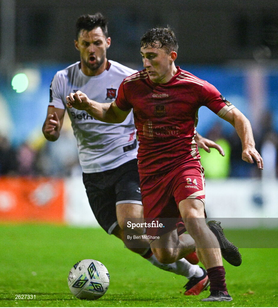 15 September 2023; Ed McCarthy of Galway United and Patrick Hoban of Dundalk during the Sports Direct Men’s FAI Cup quarter-final match between Galway United and Dundalk at Eamonn Deacy Park in Galway. Photo by Ben McShane/Sportsfile