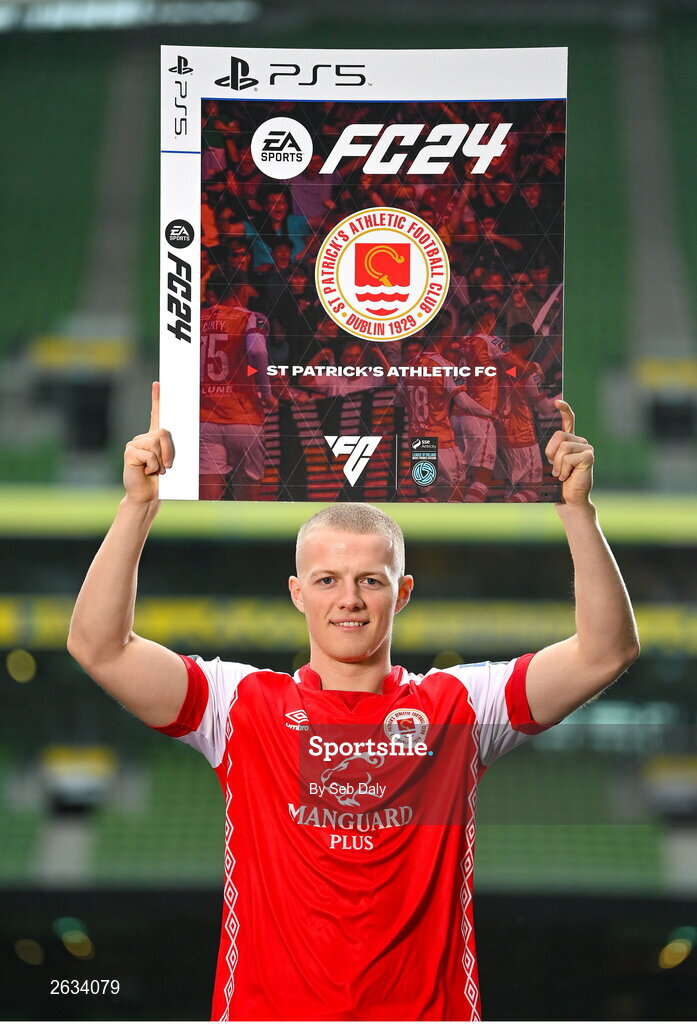 27 September 2023; Join the Club as EA SPORTS FC welcomes the SSE Airtricity League to FC 24! Featuring the individual club crest of all 10 Premier Division teams, these exclusive sleeves will be available to download free from https://www.ea.com/FC24 when the game launches worldwide this Friday, September 29th!. Pictured is Tom Grivosti of St Patrick's Athletic during the EA SPORTS FC 24 SSE Airtricity League Cover Launch at the Aviva Stadium in Dublin. Photo by Seb Daly/Sportsfile