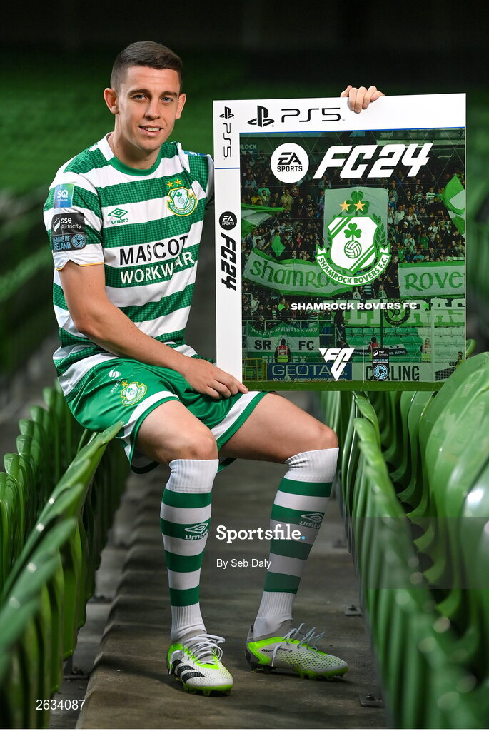 27 September 2023; Join the Club as EA SPORTS FC welcomes the SSE Airtricity League to FC 24! Featuring the individual club crest of all 10 Premier Division teams, these exclusive sleeves will be available to download free from https://www.ea.com/FC24 when the game launches worldwide this Friday, September 29th!. Pictured is Gary O'Neill of Shamrock Rovers during the EA SPORTS FC 24 SSE Airtricity League Cover Launch at the Aviva Stadium in Dublin. Photo by Seb Daly/Sportsfile