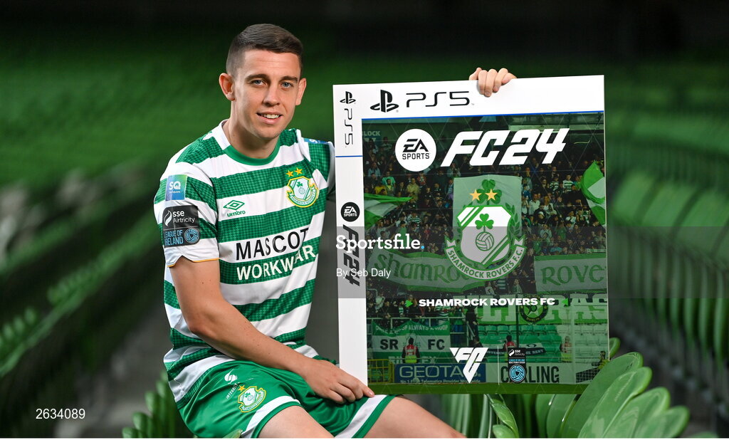 27 September 2023; Join the Club as EA SPORTS FC welcomes the SSE Airtricity League to FC 24! Featuring the individual club crest of all 10 Premier Division teams, these exclusive sleeves will be available to download free from https://www.ea.com/FC24 when the game launches worldwide this Friday, September 29th!. Pictured is Gary O'Neill of Shamrock Rovers during the EA SPORTS FC 24 SSE Airtricity League Cover Launch at the Aviva Stadium in Dublin. Photo by Seb Daly/Sportsfile