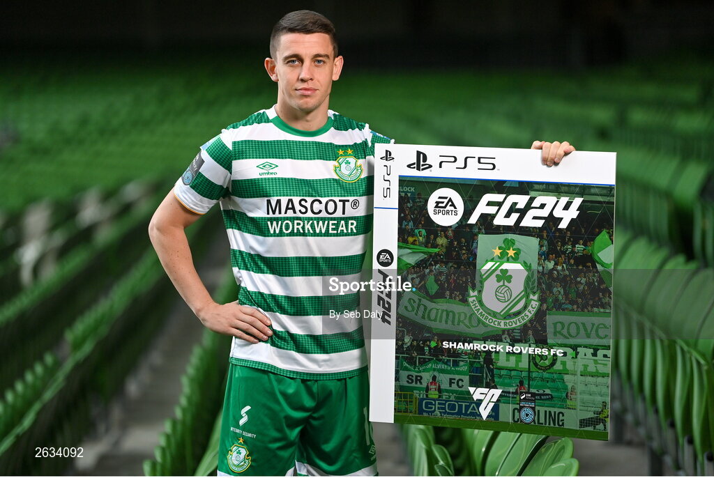 27 September 2023; Join the Club as EA SPORTS FC welcomes the SSE Airtricity League to FC 24! Featuring the individual club crest of all 10 Premier Division teams, these exclusive sleeves will be available to download free from https://www.ea.com/FC24 when the game launches worldwide this Friday, September 29th!. Pictured is Gary O'Neill of Shamrock Rovers during the EA SPORTS FC 24 SSE Airtricity League Cover Launch at the Aviva Stadium in Dublin. Photo by Seb Daly/Sportsfile