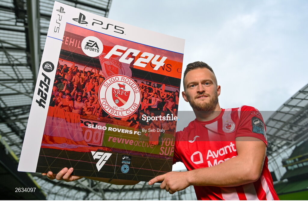 27 September 2023; Join the Club as EA SPORTS FC welcomes the SSE Airtricity League to FC 24! Featuring the individual club crest of all 10 Premier Division teams, these exclusive sleeves will be available to download free from https://www.ea.com/FC24 when the game launches worldwide this Friday, September 29th!. Pictured is David Cawley of Sligo Rovers during the EA SPORTS FC 24 SSE Airtricity League Cover Launch at the Aviva Stadium in Dublin. Photo by Seb Daly/Sportsfile