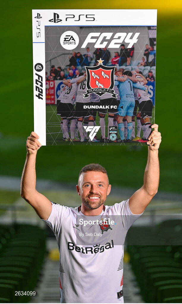 27 September 2023; Join the Club as EA SPORTS FC welcomes the SSE Airtricity League to FC 24! Featuring the individual club crest of all 10 Premier Division teams, these exclusive sleeves will be available to download free from https://www.ea.com/FC24 when the game launches worldwide this Friday, September 29th!. Pictured is Keith Ward of Dundalk during the EA SPORTS FC 24 SSE Airtricity League Cover Launch at the Aviva Stadium in Dublin. Photo by Seb Daly/Sportsfile