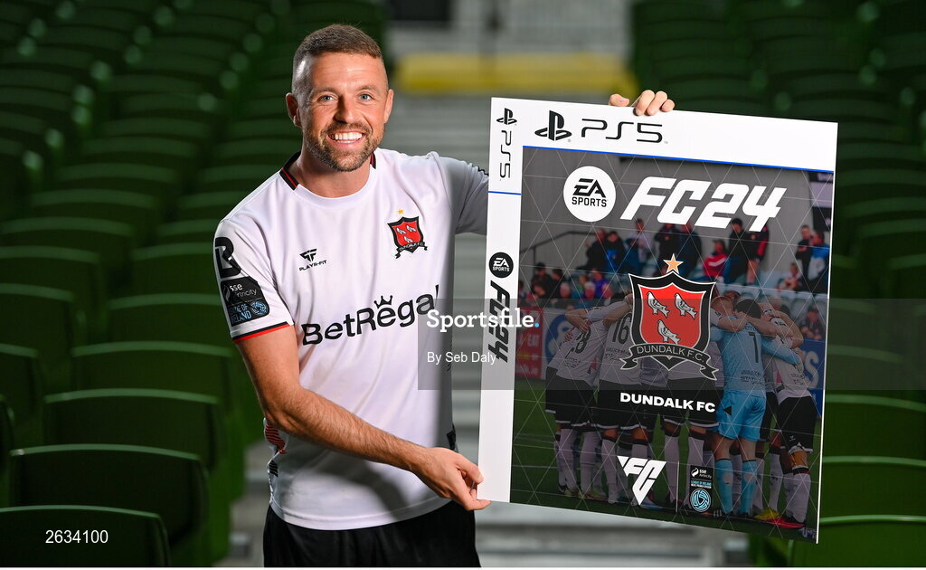 27 September 2023; Join the Club as EA SPORTS FC welcomes the SSE Airtricity League to FC 24! Featuring the individual club crest of all 10 Premier Division teams, these exclusive sleeves will be available to download free from https://www.ea.com/FC24 when the game launches worldwide this Friday, September 29th!. Pictured is Keith Ward of Dundalk during the EA SPORTS FC 24 SSE Airtricity League Cover Launch at the Aviva Stadium in Dublin. Photo by Seb Daly/Sportsfile