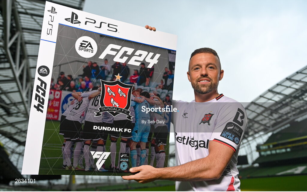 27 September 2023; Join the Club as EA SPORTS FC welcomes the SSE Airtricity League to FC 24! Featuring the individual club crest of all 10 Premier Division teams, these exclusive sleeves will be available to download free from https://www.ea.com/FC24 when the game launches worldwide this Friday, September 29th!. Pictured is Keith Ward of Dundalk during the EA SPORTS FC 24 SSE Airtricity League Cover Launch at the Aviva Stadium in Dublin. Photo by Seb Daly/Sportsfile