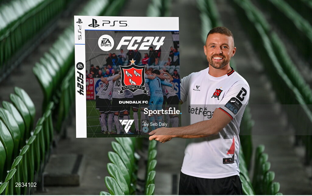 27 September 2023; Join the Club as EA SPORTS FC welcomes the SSE Airtricity League to FC 24! Featuring the individual club crest of all 10 Premier Division teams, these exclusive sleeves will be available to download free from https://www.ea.com/FC24 when the game launches worldwide this Friday, September 29th!. Pictured is Keith Ward of Dundalk during the EA SPORTS FC 24 SSE Airtricity League Cover Launch at the Aviva Stadium in Dublin. Photo by Seb Daly/Sportsfile