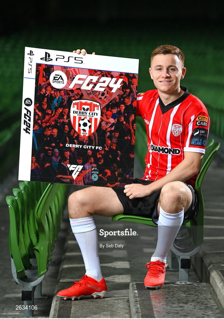 27 September 2023; Join the Club as EA SPORTS FC welcomes the SSE Airtricity League to FC 24! Featuring the individual club crest of all 10 Premier Division teams, these exclusive sleeves will be available to download free from https://www.ea.com/FC24 when the game launches worldwide this Friday, September 29th!. Pictured is Brandon Kavanagh of Derry City during the EA SPORTS FC 24 SSE Airtricity League Cover Launch at the Aviva Stadium in Dublin. Photo by Seb Daly/Sportsfile