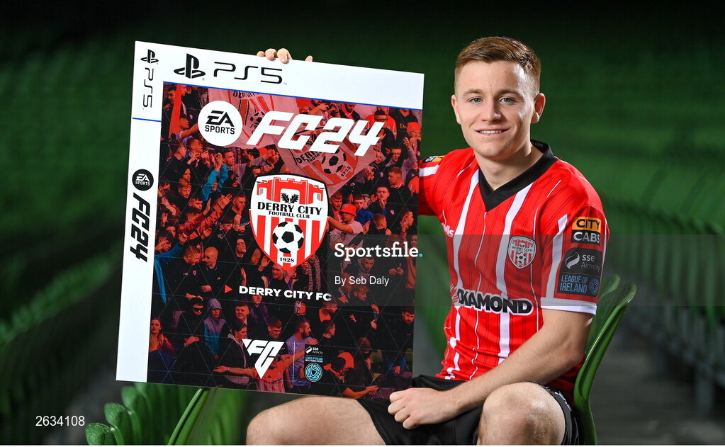 27 September 2023; Join the Club as EA SPORTS FC welcomes the SSE Airtricity League to FC 24! Featuring the individual club crest of all 10 Premier Division teams, these exclusive sleeves will be available to download free from https://www.ea.com/FC24 when the game launches worldwide this Friday, September 29th!. Pictured is Brandon Kavanagh of Derry City during the EA SPORTS FC 24 SSE Airtricity League Cover Launch at the Aviva Stadium in Dublin. Photo by Seb Daly/Sportsfile