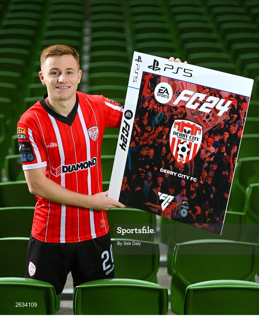 27 September 2023; Join the Club as EA SPORTS FC welcomes the SSE Airtricity League to FC 24! Featuring the individual club crest of all 10 Premier Division teams, these exclusive sleeves will be available to download free from https://www.ea.com/FC24 when the game launches worldwide this Friday, September 29th!. Pictured is Brandon Kavanagh of Derry City during the EA SPORTS FC 24 SSE Airtricity League Cover Launch at the Aviva Stadium in Dublin. Photo by Seb Daly/Sportsfile