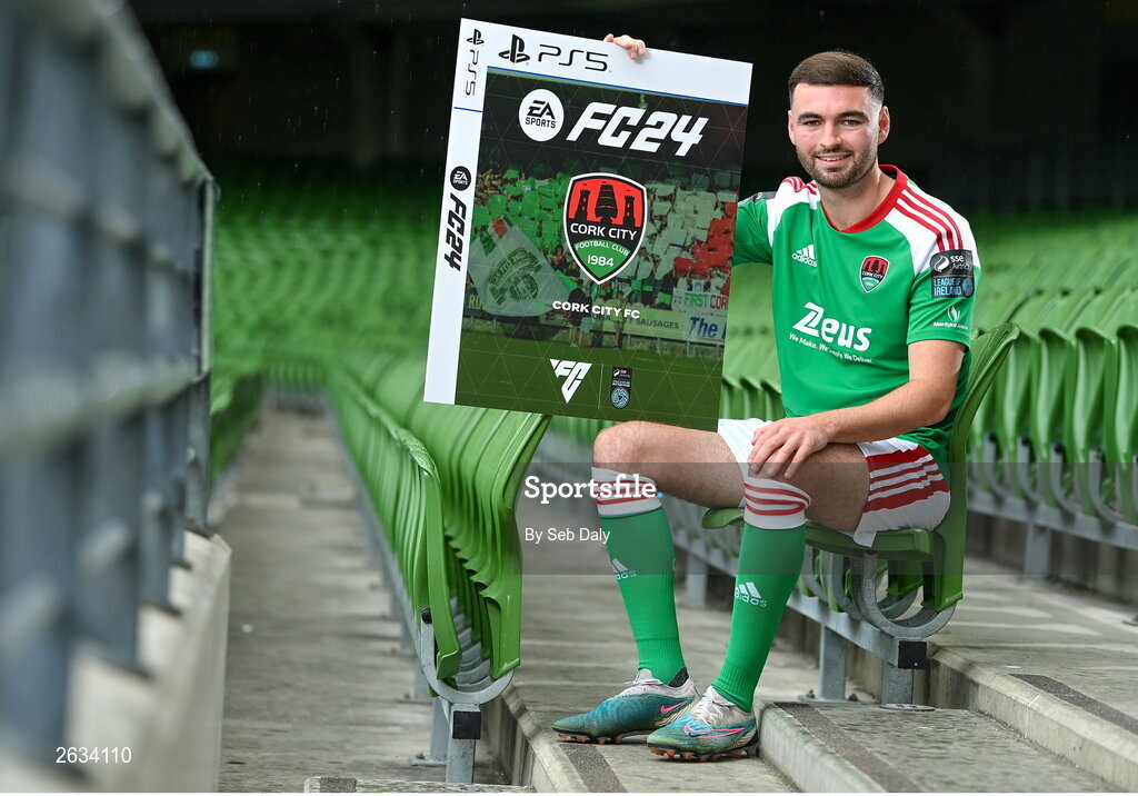 27 September 2023; Join the Club as EA SPORTS FC welcomes the SSE Airtricity League to FC 24! Featuring the individual club crest of all 10 Premier Division teams, these exclusive sleeves will be available to download free from https://www.ea.com/FC24 when the game launches worldwide this Friday, September 29th!. Pictured is Gordon Walker of Cork City during the EA SPORTS FC 24 SSE Airtricity League Cover Launch at the Aviva Stadium in Dublin. Photo by Seb Daly/Sportsfile