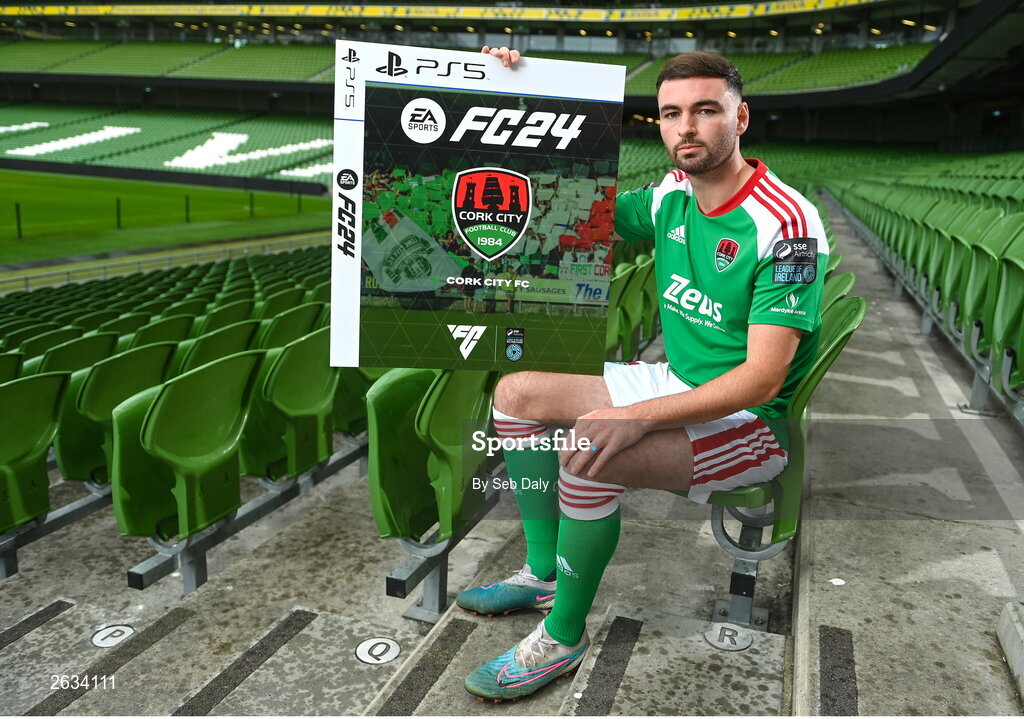 27 September 2023; Join the Club as EA SPORTS FC welcomes the SSE Airtricity League to FC 24! Featuring the individual club crest of all 10 Premier Division teams, these exclusive sleeves will be available to download free from https://www.ea.com/FC24 when the game launches worldwide this Friday, September 29th!. Pictured is Gordon Walker of Cork City during the EA SPORTS FC 24 SSE Airtricity League Cover Launch at the Aviva Stadium in Dublin. Photo by Seb Daly/Sportsfile