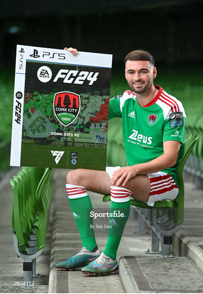 27 September 2023; Join the Club as EA SPORTS FC welcomes the SSE Airtricity League to FC 24! Featuring the individual club crest of all 10 Premier Division teams, these exclusive sleeves will be available to download free from https://www.ea.com/FC24 when the game launches worldwide this Friday, September 29th!. Pictured is Gordon Walker of Cork City during the EA SPORTS FC 24 SSE Airtricity League Cover Launch at the Aviva Stadium in Dublin. Photo by Seb Daly/Sportsfile