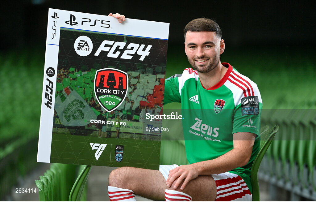 27 September 2023; Join the Club as EA SPORTS FC welcomes the SSE Airtricity League to FC 24! Featuring the individual club crest of all 10 Premier Division teams, these exclusive sleeves will be available to download free from https://www.ea.com/FC24 when the game launches worldwide this Friday, September 29th!. Pictured is Gordon Walker of Cork City during the EA SPORTS FC 24 SSE Airtricity League Cover Launch at the Aviva Stadium in Dublin. Photo by Seb Daly/Sportsfile