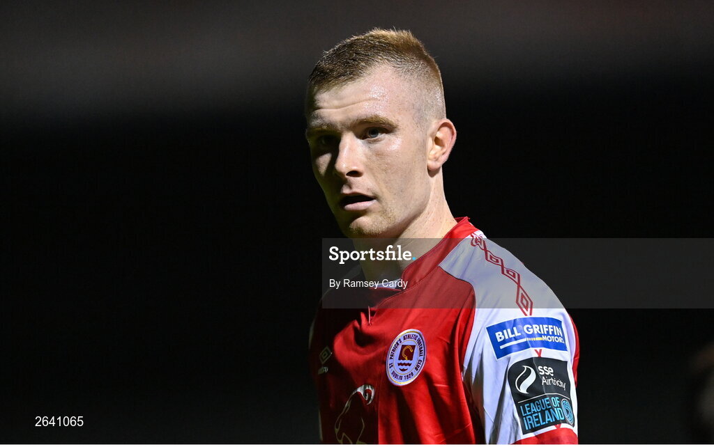 15 September 2023; Mark Doyle of St Patrick's Athletic during the Sports Direct Men’s FAI Cup quarter-final match between Finn Harps and St Patrick's Athletic at Finn Park in Ballybofey, Donegal. Photo by Ramsey Cardy/Sportsfile