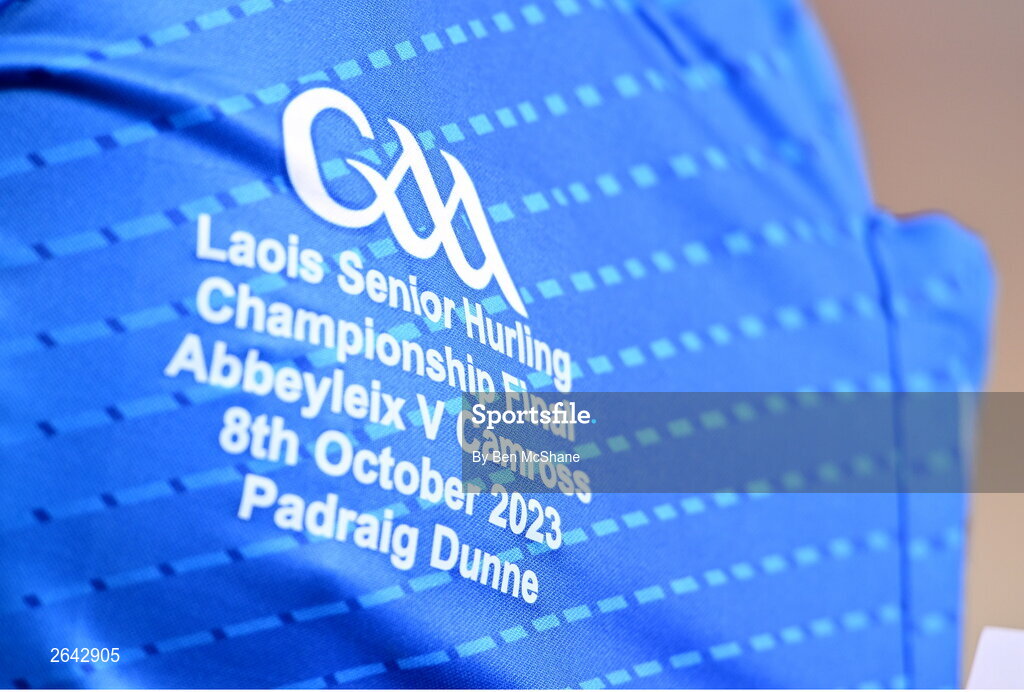 8 October 2023; A detailed view of the jersey of referee Padraig Dunne before the Laois County Senior Hurling Championship Final match between Abbeyleix St Lazarians and Camross at Laois Hire O'Moore Park in Portlaoise, Laois. Photo by Ben McShane/Sportsfile
