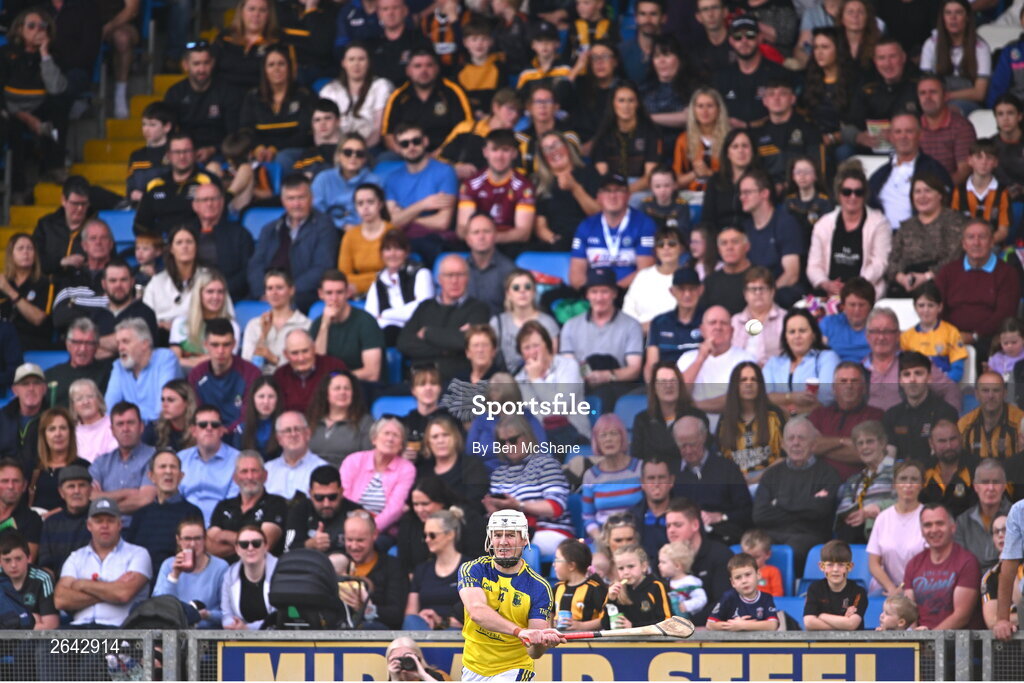 8 October 2023; Colin Byrne of Abbeyleix St Lazarian's watches his free during the Laois County Senior Hurling Championship Final match between Abbeyleix St Lazarians and Camross at Laois Hire O'Moore Park in Portlaoise, Laois. Photo by Ben McShane/Sportsfile