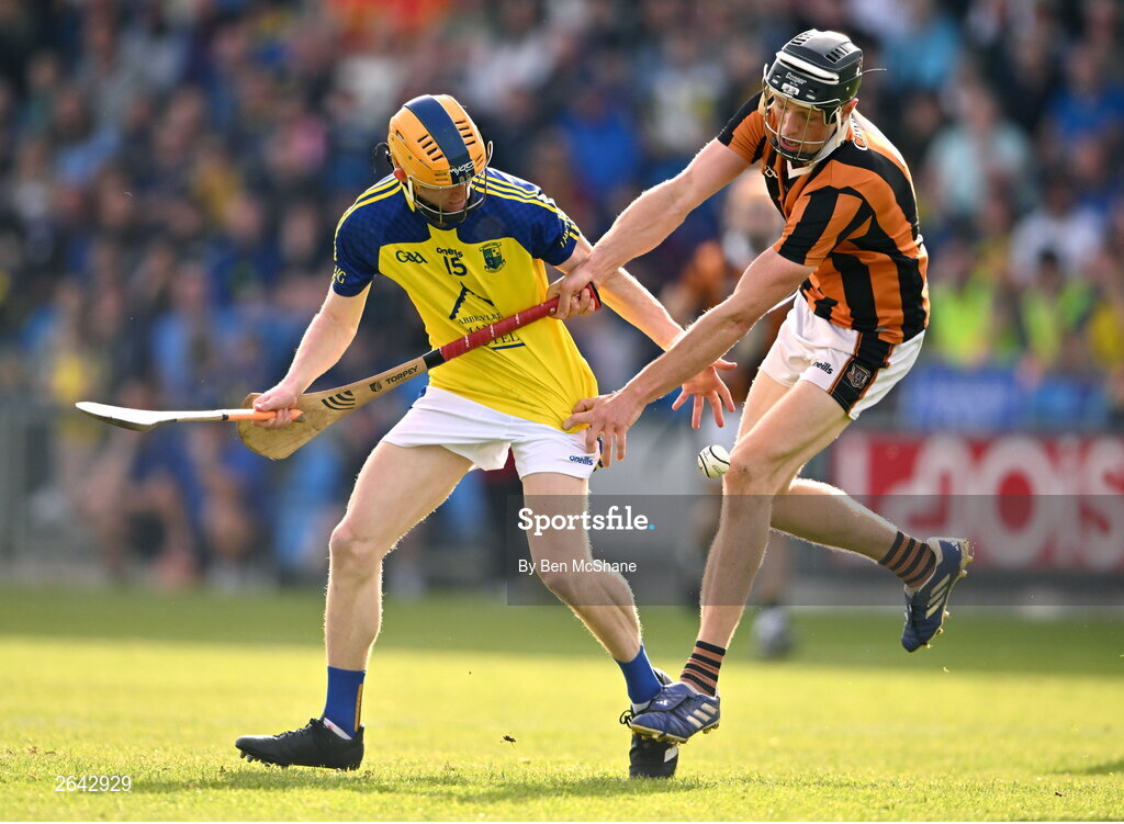 8 October 2023; Colin Byrne of Abbeyleix St Lazarian's in action against Darragh Duggan of Camross during the Laois County Senior Hurling Championship Final match between Abbeyleix St Lazarians and Camross at Laois Hire O'Moore Park in Portlaoise, Laois. Photo by Ben McShane/Sportsfile