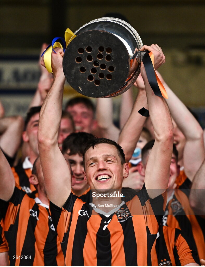 8 October 2023; Camross captain Darragh Duggan lifts the cup after the Laois County Senior Hurling Championship Final match between Abbeyleix St Lazarians and Camross at Laois Hire O'Moore Park in Portlaoise, Laois. Photo by Ben McShane/Sportsfile
