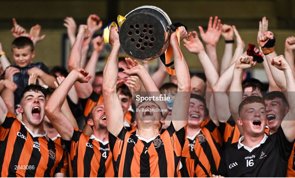 8 October 2023; Camross captain Darragh Duggan lifts the cup alongside his teammates after the Laois County Senior Hurling Championship Final match between Abbeyleix St Lazarians and Camross at Laois Hire O'Moore Park in Portlaoise, Laois. Photo by Ben McShane/Sportsfile