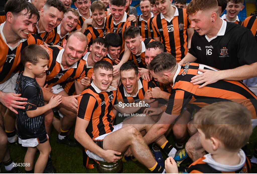 8 October 2023; Camross players put teammate Tomás Keyes, centre, sitting on the cup after the Laois County Senior Hurling Championship Final match between Abbeyleix St Lazarians and Camross at Laois Hire O'Moore Park in Portlaoise, Laois. Photo by Ben McShane/Sportsfile
