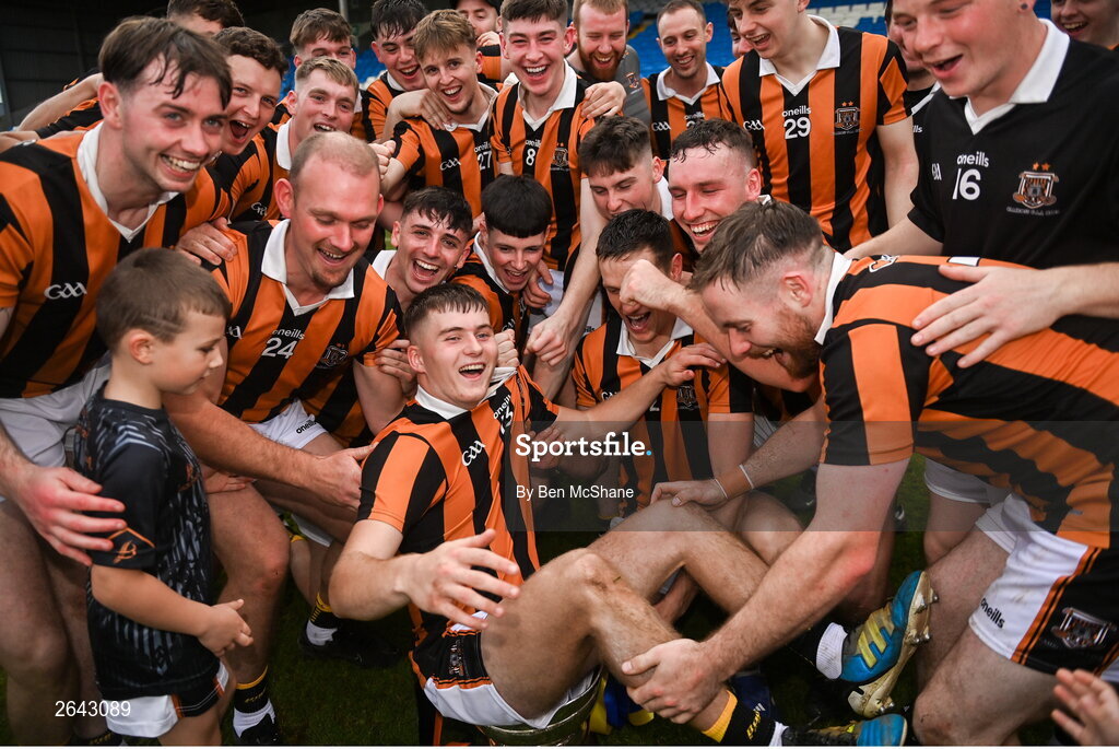 8 October 2023; Camross players put teammate Tomás Keyes, centre, sitting on the cup after the Laois County Senior Hurling Championship Final match between Abbeyleix St Lazarians and Camross at Laois Hire O'Moore Park in Portlaoise, Laois. Photo by Ben McShane/Sportsfile
