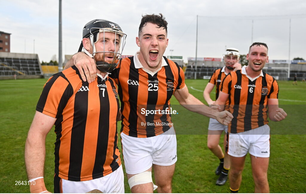 8 October 2023; Eoin Dowling, right, and Dwane Palmer of Camross celebrate after the Laois County Senior Hurling Championship Final match between Abbeyleix St Lazarians and Camross at Laois Hire O'Moore Park in Portlaoise, Laois. Photo by Ben McShane/Sportsfile
