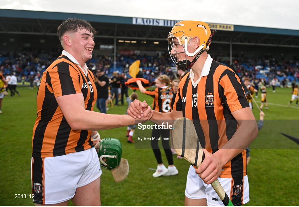 8 October 2023; James Cuddy, right, and Daniel Delaney of Camross celebrate after the Laois County Senior Hurling Championship Final match between Abbeyleix St Lazarians and Camross at Laois Hire O'Moore Park in Portlaoise, Laois. Photo by Ben McShane/Sportsfile