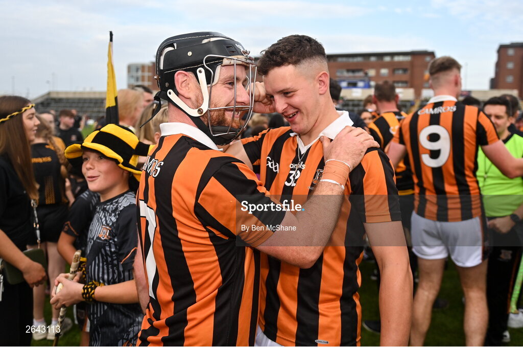 8 October 2023; Dwane Palmer, left, and Robert Delaney of Camross celebrate after the Laois County Senior Hurling Championship Final match between Abbeyleix St Lazarians and Camross at Laois Hire O'Moore Park in Portlaoise, Laois. Photo by Ben McShane/Sportsfile