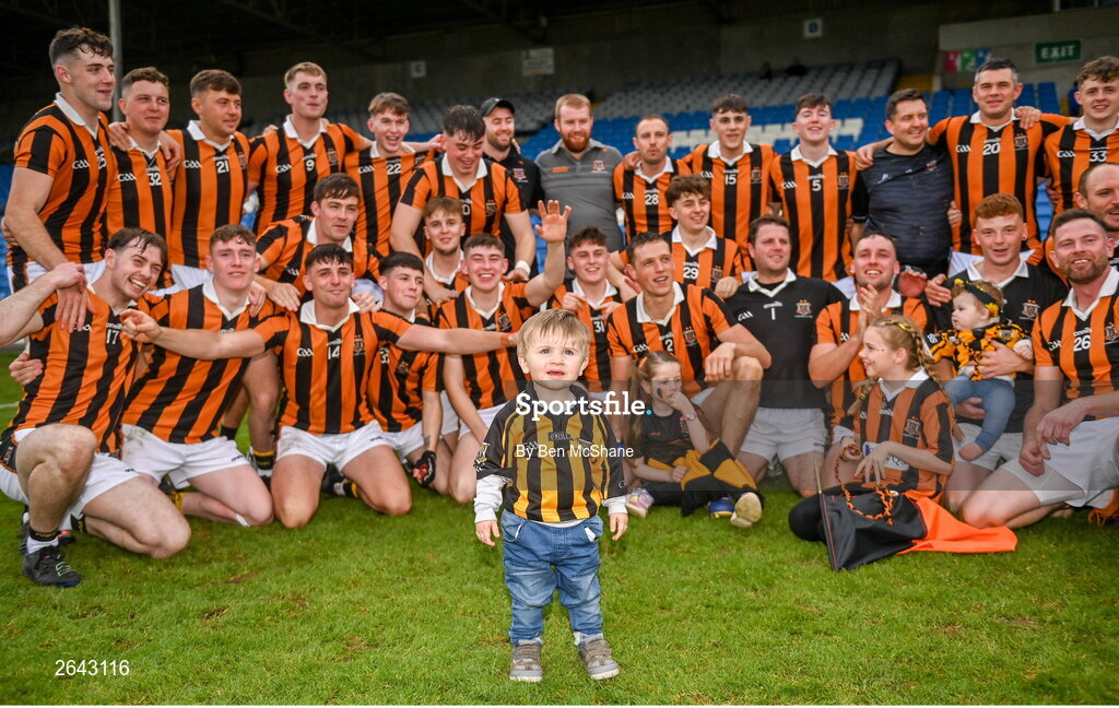8 October 2023; Camross supporter Caiden Scully, age 1, from Camcross keeps watch as Camross players celebrates with the cup after the Laois County Senior Hurling Championship Final match between Abbeyleix St Lazarians and Camross at Laois Hire O'Moore Park in Portlaoise, Laois. Photo by Ben McShane/Sportsfile