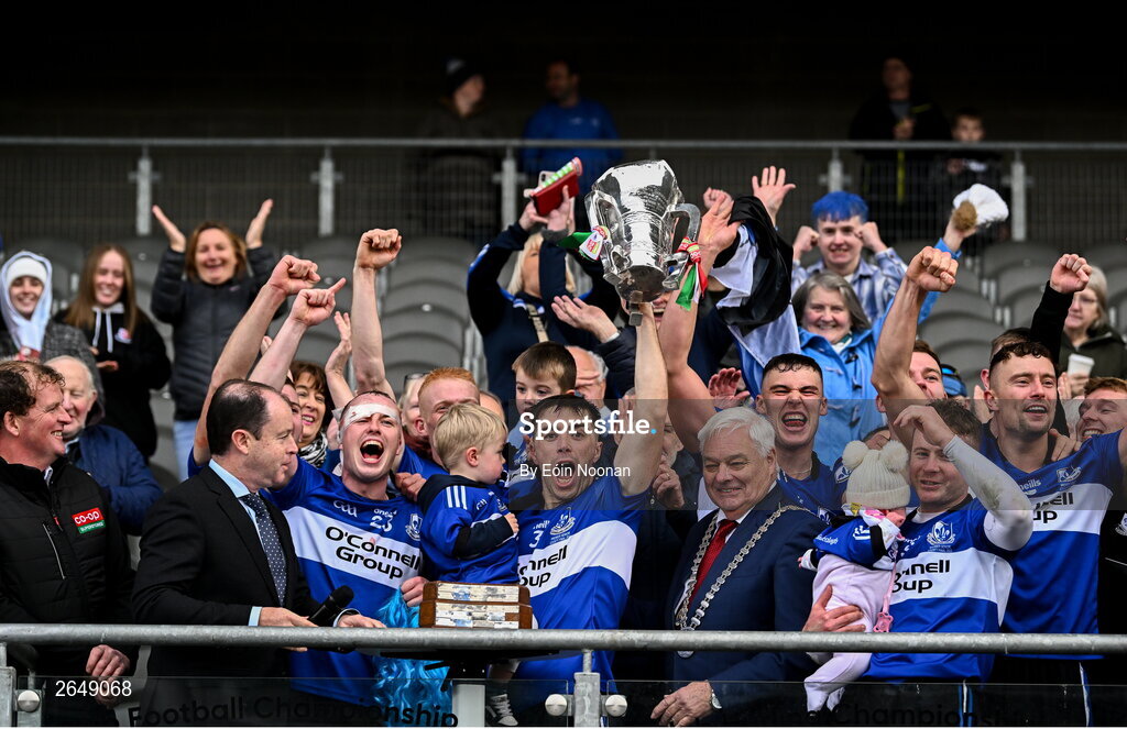 15 October 2023; Sarsfields captain Conor O'Sullivan lifting the cup after the Cork County Premier Senior Club Hurling Championship final between Sarsfields and Midleton at Páirc Uí Chaoimh in Cork. Photo by Eóin Noonan/Sportsfile
