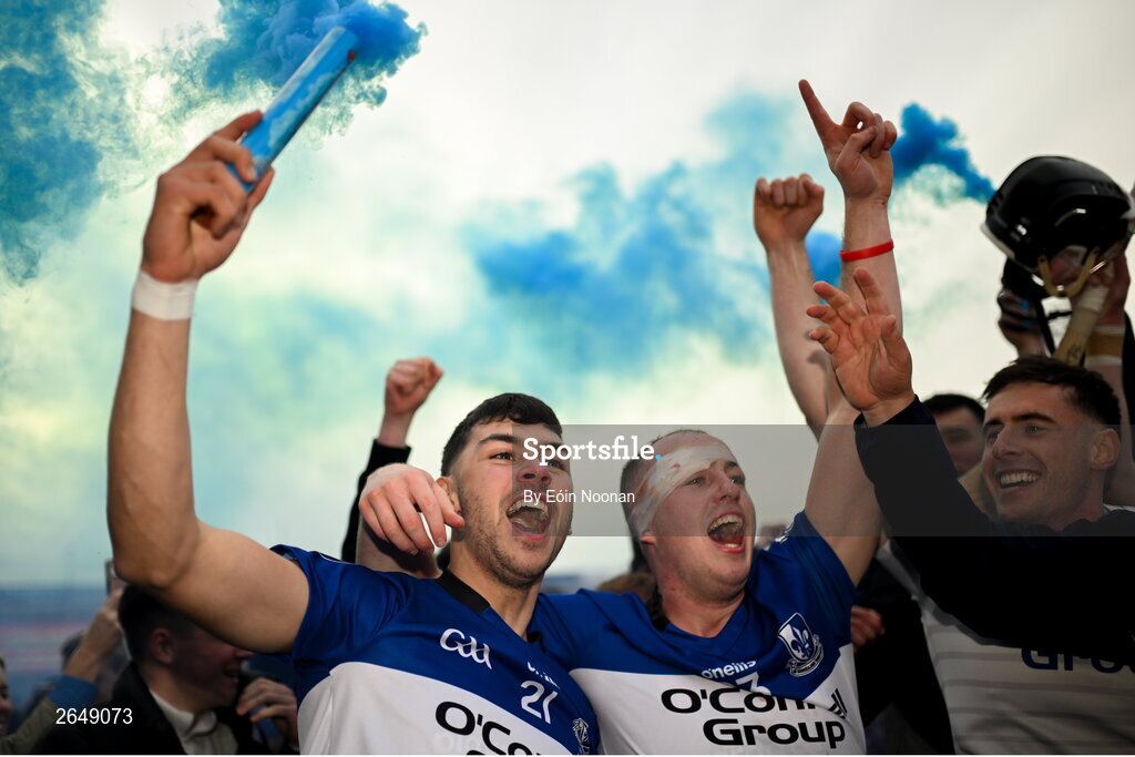15 October 2023; Daragh Long, left, and Daniel Hogan of Sarsfields celebrate with team-mates after the Cork County Premier Senior Club Hurling Championship final between Sarsfields and Midleton at Páirc Uí Chaoimh in Cork. Photo by Eóin Noonan/Sportsfile
